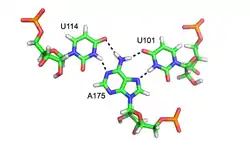 عرض عن قرب لثلاثي الثلم الكبير U114:A175-U101 المكوَّن في عقدة كاذبة طبيعية لتيلوميراز رنا بشري. الروابط الهيدروجينية ممثلة بخطوط سوداء متقطعة، ذرات الآزوت ملونة بالأزرق والأكسجين بالأحمر.[1]