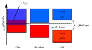أما المواد الصلبة الأخرى (عوازل أو أنصاف نواقل) فيكون فيها النطاق السفلي المشغول بالكامل بالإلكترونات، يدعى هذه النطاق باسم ""نطاق التكافؤ" (valance band) وتدعى الإلكترونات التي تشغل هذا النطاق باسم "إلكترونات النقل" (valance band)(valence electrons). أما النطاق العلوي الذي تكون في معظمه غير مشغول فيدعى باسم "نطاق التوصيل" (conduction band) لأن الإلكترونات تتواجد فيه فقط عندما تكون المادة مثارة (بالتسخين مثلا) عندها تقوم هذه المواد بنقل التيار الكهربائي. يكون الفرق بين المواد العازلة وأنصاف النواقل هو أن فجوة الطاقة بين نطاق التكافؤ ونطاق النقل تكون أكبر في المواد العازلة منها في أنصاف النواقل، وبالتالي يكون من الصعب على الإلكترونات الانتقال إلى ذلك النطاق وبالمحصلة تكون الناقلية الكهربائية أضعف. من أهم العوامل التي تساعد الإلكترونات على الوصول إلى نطاق النقل هو الطاقة الحرارية، حيث أن ناقلية أنصاف النواقل تعتمد بشكل كبير على درجة حرارة المادة.