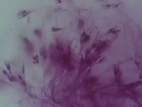 نوع البنيسيليوم تحت التصوير المجهري بالحقل الساطع (تكبير 10 × 100) بصبغة أزرق القطن-اللاكتوفينول