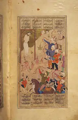 إرسل إسفنديار ابنه بهمن إلى زابلستان ومعه رسالة حملها من أبيه إسفنديار إلى رستم بطل الأبطال في الشاهنامة. فوصي اسفنديار إلى رستم بتربية ولده بهمن، وإقامته بزابلستان. فربّي رستم بهمن كما ربّي سياوش من قبل. سلم كشتاسب إليه مفاتيح الكنوز والخزائن فتسلم اليه سرير الملك والتاج السلطنة وكذلك أصبح بهمن ملكاً في إيران بعد كشتاسب. وقصد بهمن انتقام لإسفنديار والأخذ بثأره. وسار حتى نزل على هيرمند فأرسل إلى دستان وأعمله أنه قد جاء طالبا لثأر أبيه وإخوته. فأرسل زال رسالة إلي بهمن، فغضب بهمن من كلامه، وأمر بفمه فقيد وحبس، ولم يسمع فيه شفاعة أحد من أصحابه.و قاتل بهمن لفرامرز بن رستم ولزواره فقتلا. وكان لبهمن ابن شجاع يسمى ساسان، وبنت تسمى هماى ذات رأى وعقل، وكانت تلقب جهرآزاد. وتزوج بهمن من ابنته هماي وكان يحبها كثيراً لفرط حسنها وجمالها. مات بهمن وكانت مدّة ملكه ستين سنة.