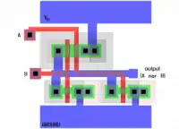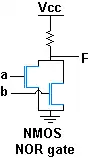 تظهر هذه المخططات الموجودة أعلاه : بناء بوابة NOR ذات دخلين باستخدام الدائرة NMOS. فإذا كان أي من المدخلات عاليا (1 منطقي)، فإن الـ NMOS المقابل يكون مشغلا والخرج المسحوب يكون منخفضا (0 منطقي)، وفي غير هذه الحالة يكون الخرج المسحوب عاليا من خلال مقاوم ساحب. ويظهر الرسم في الأسفل بوابة NOR ذات دخلين باستخدام تكنولوجيا ال CMOS. والصمامات الثنائية والمقاومات في المدخلات هي لحماية مكونات الـ CMOS من التلف نتيجة لتفريغ الشحنات الالكتروستاتيكية (ESD)، ولا تلعب أي دور في الوظيفة المنطقية للدائرة.