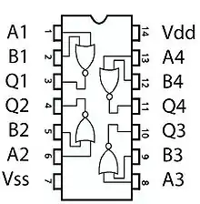 1 الدخل A1 2 الدخل B1 3 الخرج Q1 4 الخرج Q2 5 الدخل B2 6 الدخل A2 7 VSS 8 الدخل A3 9 الدخل B3 10 الخرج Q3 11 الخرج Q4 12 الدخل B4 13 الدخل A4 14 VDD |