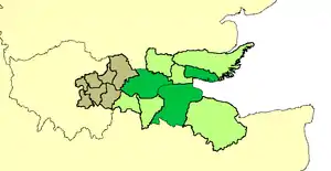| المنطقة | الأحياء | ![]() بلدية لندن (بني)، مناطق غير تابعة للعاصمة (أخضر) والسلطات الوحدوية (أخضر غامق). |