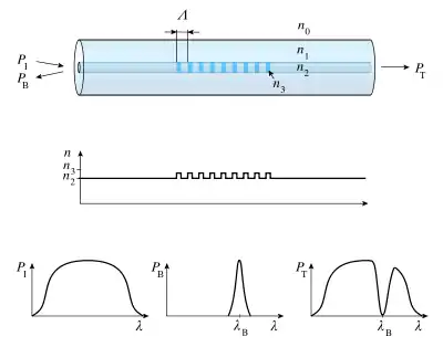 على حافتي الليف الزجاجي ينشأ تضمين دوري لمعامل الإنكسار بقيم مختلفة وهو ما يؤدي إلى السماح للأشعة الضوئية بالمرور أو يعكسها حسب طولها الموجي.