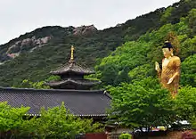 ![]() سقف المعبد ضمن الطبيعة ويظهر تمثال بودا غُمدونغ مِرُكدايبُل | |