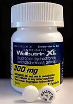 البوبروبيون عبارة عن أقراص مغلفة بنفسجية اللون بتركيز 150 ملغم ذات مفعول ممتد.[10] من الأدوية المستخدمة للتحكم في الشوق لتعاطي للنيكوتين ويخفف من أعراض الامتناع عنه مثل القلق والتوتر. لا توجد أي له علاقة مع النيكوتين من ناحية التركيب الكيميائي.