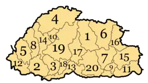 تقسم بوتان إلى أربعة دزونغدي (مناطق إدارية). تقسم الدزونغدي بدورها إلى دزونغخاغ (مناطق). هناك 20 دزنغ خاغ في بوتان. تنقسم دزونغ خاغ الكبري إلى مقاطعات فرعية تعرف باسم دونغ خاغ. في المستوى الأساسي، تشكل مجموعات من القرى دائرة اسمها جيونغ (كتل) وتدار من قبل غوب ينتخب من قبل الشعب.