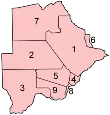 أ-المقاطعات: الوسطي Central,و غانزي Ghanzi, وكجالاجادي Kgalagadi, وكجاتلينج Kgatleng, وكوينينج Kweneng, والشمالية الشرقية Northeast, والشمالية الغربية Northwest, والجنوبية الشرقية Southeast, والجنوبية Southern.