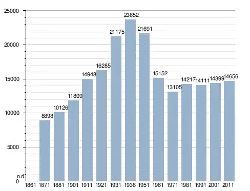 في سنة 1871 بلغ عدد السكان 8٬898 نسمة، وتطور العدد ليصل في سنة 2011 لـ 14٬656 نسمة.