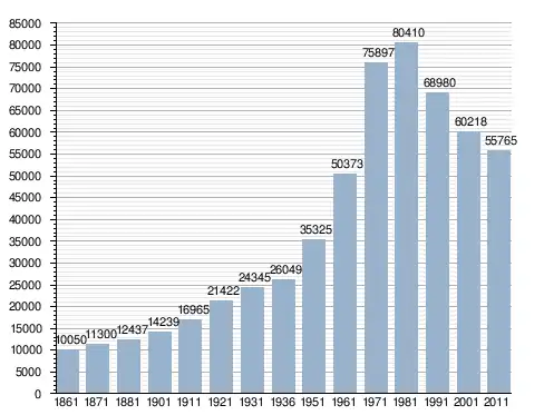 في سنة 1861 بلغ عدد السكان 10٬050 نسمة، وتطور العدد ليصل في سنة 2011 لـ 55٬765 نسمة.