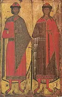 أيقونة القديسين بوريس وجليب على ظهور الخيل. موسكو ، منتصف القرن الرابع عشر ( معرض تريتياكوف ).