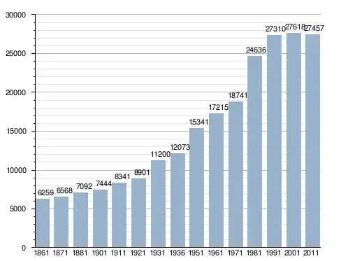 في سنة 1861 بلغ عدد السكان 6٬259 نسمة، وتطور العدد ليصل في سنة 2011 لـ 27٬457 نسمة.