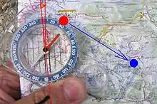 والبوصلة الحديثة لديها اتجاه سفر اضافى DOT. للتحقق من واحد في التقدم على طول مسار أو السمت، أو لضمان أن الكائن في عرض هو في الواقع من جهة، وقراءة البوصلة الجديدة التي يمكن اتخاذها لتحقيق هدف إذا مرئية (هنا، الجبل الكبير). بعد التأشير على السهم وزارة النقل على اللوح الأساس في الهدف، هو البوصلة الموجهة بحيث الإبرة فرضه على السهم في توجيه الكبسولة. حمل الناتجة هو مبين في تحمل مغناطيسية مع الهدف. مرة أخرى، إذا واحد هو استخدام "الحقيقية" أو المحامل الخريطة، والبوصلة لا تملك مسبقا، قبل تعديل الانحراف، وبالإضافة إلى ذلك لا بد من إضافة أو طرح الانحراف المغنطيسي لتحويل تحمل المغناطيسية إلى تأثير حقيقي. والقيمة الدقيقة للالانحراف المغنطيسي هي المكان التي تعتمد على ويختلف بمرور الوقت، على الرغم من الانحراف وكثيرا ما يجري على الخريطة نفسها، أو الحصول على الخط من مواقع مختلفة. إذا كان مسافر ما فتئت تتابع المسار الصحيح، وينبغي أن البوصلة 'تصحيح (الحقيقية) واضعة أشارت بشكل وثيق تتوافق مع تحمل الحقيقية التي سبق الحصول عليها من على الخريطة.[41]