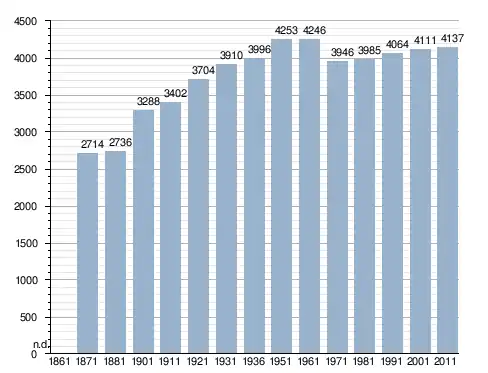 في سنة 1871 بلغ عدد السكان 2٬714 نسمة، وتطور العدد ليصل في سنة 2011 لـ 4٬137 نسمة.