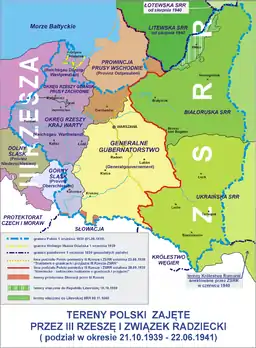 بألوان داكنة، الأراضي البولندية التي ضمتها ألمانيا النازية والاتحاد السوفيتي، مع وجود حكومة عامة شبه استعمارية بلون أصفر فاتح (وسط)