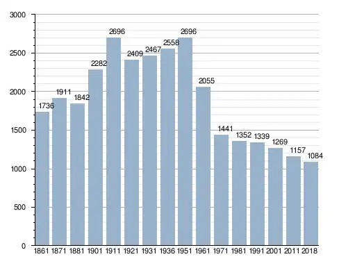 في سنة 1861 بلغ عدد السكان 1٬736 نسمة، وتطور العدد ليصل في سنة 2018 لـ 1٬084 نسمة.