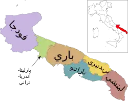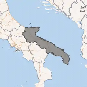 | التقسيمات الإدارية | مقاطعة باري (–31 ديسمبر 2014) مقاطعة بارليتا أندريا تراني مقاطعة برينديزي مقاطعة فودجا مقاطعة لتشه مقاطعة تارانتو مدينة متروبوليتان باري (1 يناير 2015–) مقاطعة ماتيرا | |