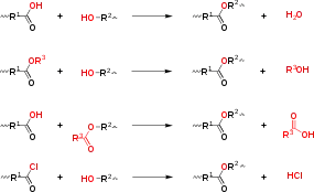 تم تطبيق التفاعل بين كلوريد الدياسيل diacyl chlorides والكحوليات أو المركبات الفينولية على نطاق واسع على تخليق البوليستر وخضع للعديد من النقاش في المراجعات وفصول الكتب.[17][20][21][22]