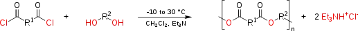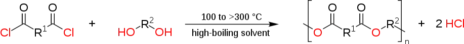 ينتج عن تفاعل درجة الحرارة المرتفعة (من 100 إلى > 300 درجة مئوية) لكلوريد ثنائي الأسيل مع كحول الديال البوليستر وكلوريد الهيدروجين. في ظل هذه درجات الحرارة المرتفعة نسبيًا، يستمر التفاعل سريعًا بدون محفز:[22]