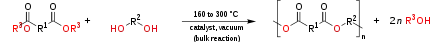 الأسترة التبادلية transesterification : هو تكاثف أوليغومر oligomer منتهي بالكحول وأوليغومير منتهي بالإستر لتكوين ارتباط إستر، مع فقد كحول. R و R' هما سلسلتا oligomer ، R'' عبارة عن وحدة قربانية مثل مجموعة الميثيل (الميثانول هو المنتج الثانوي لتفاعل الأسترة).