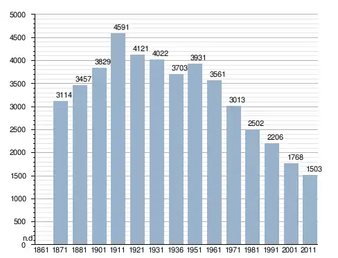 في سنة 1871 بلغ عدد السكان 3٬114 نسمة، وتطور العدد ليصل في سنة 2011 لـ 1٬503 نسمة.