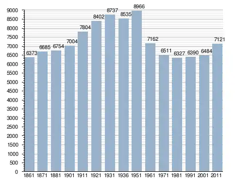 في سنة 1861 بلغ عدد السكان 6٬373 نسمة، وتطور العدد ليصل في سنة 2011 لـ 7٬121 نسمة.