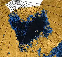 پونجا ماري من فسيفساء الألوان الزائفة في صور رادار الفتحة التركيبية للمنطقة القطبية الشمالية لتيتان. جزء من كراكن ماري يظهر أسفل اليمين.