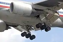 تتميز عدة هبوط الـ777 بأنها الأكبر وإطاراتها هي أكبر إطارات في تاريخ طائرات الركاب التجارية النفاثة.[10] عدة الهبوط فيها تتكون من وحدتان أساسيتان خلفيتان ووحدة أمامية. لكلا الوحدتان الأساسيتان ست عجلات في وضع ترادفي. أما الوحدة الأمامية فلها عجلتان مترادفتان. تستطيع الوحدات الأساسية التحرك ثمان درجات لمساعدة لمساعدة الوحدة الأمامية في التوجيه.[11]