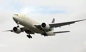 بوينغ 777 وتلقب أيضاً بـ ثلاث سبعات أو تربل سڤن هي طائرة ركاب نفاثة ذات بدن عريض من إنتاج بوينغ كومرشيل أيربلينز. الـ777 هي أكبر طائرة ثنائية المحرك، تستطيع حمل ما بين 283 إلى 368 راكب في ثلاث درجات تجارية، ويصل مداها إلى ما بين 5,235 و9،380 ميل بحري. تم طرح سلسلة طائرات الـ777 لأول مرة في عام 1989. تملأ الطائرة فجوة الحجم ما بين البوينغ 767 والبوينغ 747. دخلت الطائرة الخدمة في 7 يونيو 1995 مع خطوط يونايتد الجوية. تصنع الطائرة في مصنع بوينغ إفريت.[3]