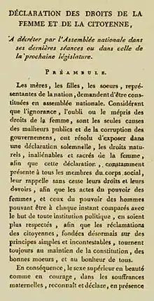 لم تتمكن الثورة الفرنسية من تشجيع الاعتراف بحقوق المرأة، الأمر الذي دفع دي جوج إلى نشر بيان حقوق المرأة والمواطنة في أوائل عام 1791. [6]