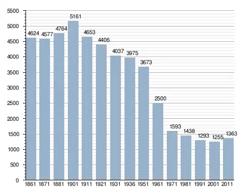 في سنة 1861 بلغ عدد السكان 4٬624 نسمة، وتطور العدد ليصل في سنة 2011 لـ 1٬363 نسمة.