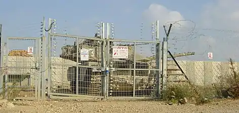 إحدى الدبابات الإسرائيلية أمام بوابة مستوطنة بيت حيفر في مدينة طولكرم خلال الحرب. (أكتوبر 2001)