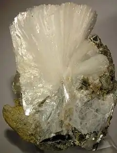| السحنة البلورية | صفائح رقيقة، بلورات موشورية إلى إبرية، غالباً في عناقيد قطرية |