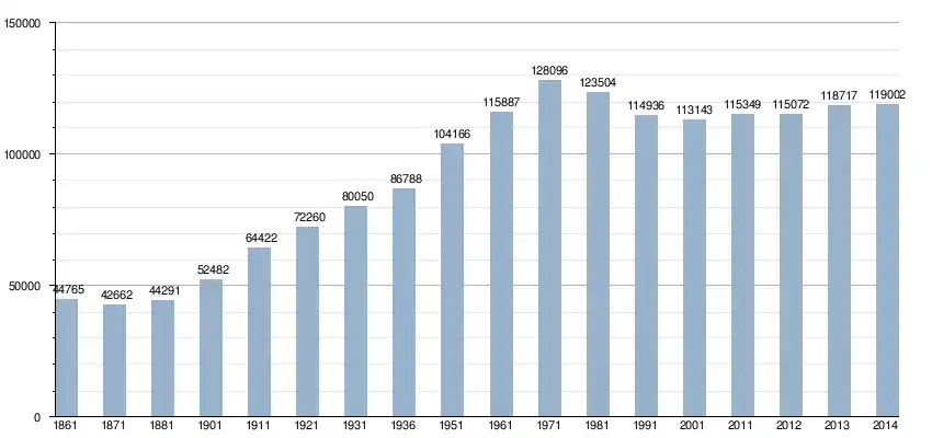 في سنة 1861 بلغ عدد السكان 44٬765 نسمة، وتطور العدد ليصل في سنة 2014 لـ 119٬002 نسمة.