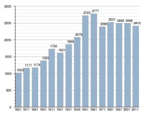 في سنة 1861 بلغ عدد السكان 1٬023 نسمة، وتطور العدد ليصل في سنة 2011 لـ 2٬415 نسمة.