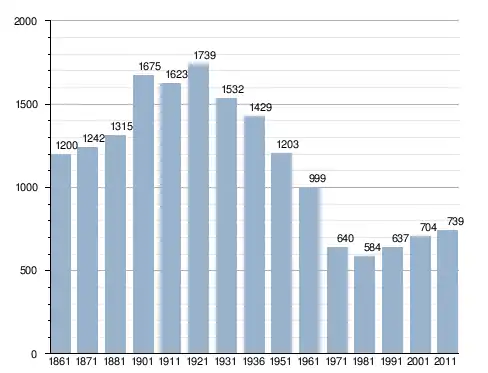 في سنة 1861 بلغ عدد السكان 1٬200 نسمة، وتطور العدد ليصل في سنة 2011 لـ 739 نسمة.