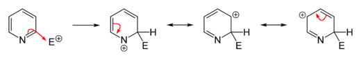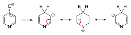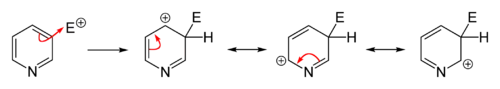 يسهل حدوث مثل هذه التفاعلات على حلقة البيريدين على العكس من البنزين، ويعود ذلك إلى انخفاض الكثافة الإلكترونية بسبب وجود ذرّة النتروجين. تتضمّن هذه التفاعلات حدوث استبدال مع حذف أيون هيدريد مع تشكّل مركّبات وسطية لها تشكيل الأراين، وغالباً ما تتمّ على الموقعين 2 و 4.[67][68]