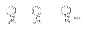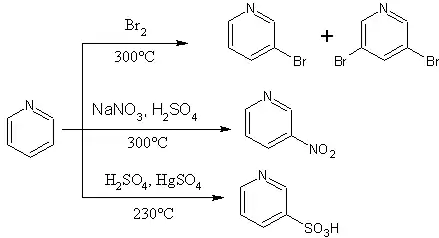 تستلزم نترتة البيريدين بشكل مباشر وجود شروطٍ قاسية، وبالنهاية تعطي مردوداً ضعيفاً. بدلاً من ذلك يمكن الحصول على 3-نترو البيريدين من مفاعلة البيريدين مع خماسي أكسيد ثنائي النتروجين بوجود الصوديوم.[76][77][78] كما يمكن إجراء عملية النترتة باستخدام كاشف رباعي فلوروبورات النترونيوم (NO2BF4) على 6،2-ثنائي برومو البيريدين، ثمّ بإزالة ذرّات البروم.[79][80] أمّا السلفنة المباشرة للبيريدين فهي أصعب من النترتة المباشرة، ولكن بالرغم من ذلك فإنّه من الممكن الحصول على بيريدين-3-حمض السلفونيك بمردود مقبول من غلي البيريدين في فائض من حمض الكبريتيك عند 230 °س.[81] إنّ التفاعل مع مجموعة SO3 تسهّل من إضافة الكبريت إلى ذرّة النتروجين، وخاصّة في وجود حفّاز من كبريتات الزئبق الثنائي.[67][82]