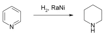يمكن اختزال البيريدين إلى البيبريدين، وهو الشكل المختزَل المهدرَج من البيريدين، باستخدام غاز الهيدروجين بوجود حفّاز نيكل راني.[88] يعدّ هذا التفاعل ناشراً للحرارة، ويحرّر طاقة مقدارها 193.8 كيلوجول/مول،[89] وهي أقلّ بقليلٍ من الطاقة المنتشرة عن هدرجة البنزين (205.3 كيلوجول/مول).[89]