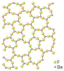 يشكّل البيريليوم مركّبات كيميائيّة مع العديد من اللافلزّات. على سبيل المثال، يعرف للبيريليوم الهاليدات اللامائيّة. إنّ لفلوريد البيريليوم BeF2 بنية شبيهة ببنية السيليكا بوجود رباعيّات سطوح من BeF4 مشتركة بالزوايا، في حين أنّ كلوريد البيريليوم BeCl2 وبروميد البيريليوم لها بنية خطّيّة من رباعيّات سطوح مشتركة بالسطح. في الحالة الغازيّة، تكون جميع هاليدات البيريليوم ذات بنية جزيئيّة أحاديّة، وليس على شكل سلاسل بوليمريّة.[44] إنّ فلوريد البيريليوم مختلف عن باقي فلوريدات الفلزّات القلويّة الترابيّة، وذلك بسبب أنّ البيريليوم يميل إلى تشكيل مركّبات تساهميّة، فلا يكون للفلوريد تلك الصفة الأيونيّة القويّة التي تكون موجودة عادةً في مركّباته. تبرز الصفة التساهميّة لمركّب BeF2 في ضعف الناقليّة الكهربائيّة لفلوريد البيريليوم في محاليله المائيّة أو في مصهوره.[47][48][49]
