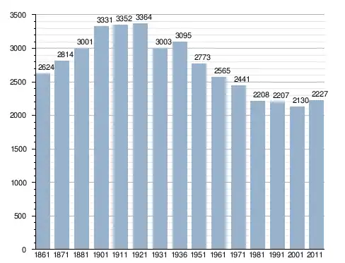 في سنة 1861 بلغ عدد السكان 2٬624 نسمة، وتطور العدد ليصل في سنة 2011 لـ 2٬227 نسمة.