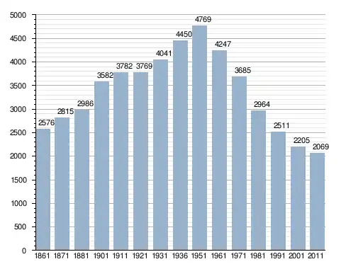 في سنة 1861 بلغ عدد السكان 2٬576 نسمة، وتطور العدد ليصل في سنة 2011 لـ 2٬069 نسمة.