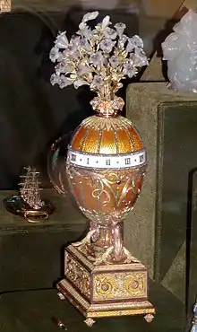 بيضة فابرجي بيض فابرجي هي مصنوعات صياغة ثمينة من صنع الصائغ الروسي بيتر كارل فابرجيه.[1] ان أهم البيضات التي صنعتها دار الصياغة فابرجي كانت موجهة للقيصر الروسي نيقولا الثاني و نيقولا الثالث و التي كانت تهدى لزوجتيهما الكسندرا فيدوروفنا و ماريا فيدوروفنا في عيد الفصح. من الخمسين بيضة المصنوعة بقيت 42 بيضة، هناك بيضتان تم طلبهما و لكنهما لم يصلا إلى طالبيهما و هما كاريليا كما ان هناك 7 بيضات كبيرة صنعت من أجل عائلة كلش في موسكو.[2]