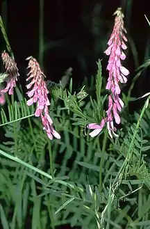 نبات عشبي. الورقة ريشية مركبة تنتهي بمحلاق. الأزهار بنفسجية (انظر الصورة). الثمرة قرن.
