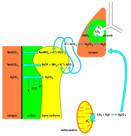 هو محلول منظم الدم ، يعمل على تنظيم قيمة الأس الهيدروجيني (البي إتش) PH value في الدورة الدموية. [7]وهو يتكون من حمض الكربونيك (H2CO3) و بيكربونات والتي لها مفعول قاعدة. فإذا كانت حموضية الدم غير كافية يذوب أيون هيدروجين (H+) من حمض الكربونيك مكونة البيكربونات. وإذا كان الدم ذو حمضية عالية (بمعنى فيه عدد زائد من أيونات الهيدروجين) فتربط بعض جزيئات البيكربونات أيونات الهيدروجين (الزائدة) وتتحول إلى جزيئات حمض الكربونيك. ويتفكك حمض الكربونيك مكونا ماء (H2O) و ثاني أكسيد الكربون (CO2). وعن طريق التنفس يخرج ثاني أكسيد الكربون مع الزفير .