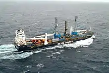 تنقل ناقلة البضائع الثقيلة متعددة الأغراض MV Beluga Indication ثلاث رافعات مرفئية متنقلة والعديد من المراكب على المحيط