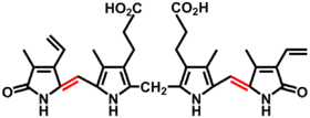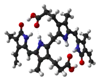 - هيم : وهو الجزء غير البروتيني من الهيموغلوبين، ويتأكسد الهيم بواسطة انزيم هيموكسيناز الذي يفكك ويؤكسد الهيم إلى بيلفردين (صبغة خضراء اللون)و حديد وأول اكسيد الكربون.