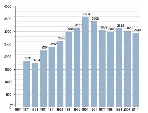 في سنة 1871 بلغ عدد السكان 1٬831 نسمة، وتطور العدد ليصل في سنة 2011 لـ 2٬948 نسمة.