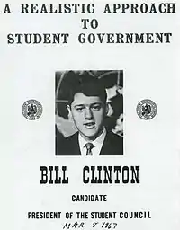 في عام 1964 وعام 1965، فاز كلينتون بانتخابات رئيس اتحاد الفصل. من عام 1964 إلى عام 1967،[15] كان متدرب ثم موظف في مكتب سيناتور أركنساس جيمس ويليام فولبرايت. خلال فترة دراسته بالكلية، انضم كلينتون إلى أخويه ألفا فاي أوميجا[16] وانتخب لأخويه فاي بيتا كابا. كما كان عضوا في order of Demolay،[17] جماعة صغيرة من الماسونيين، لكنه لم يصبح ماسونياً أبداً.[18]