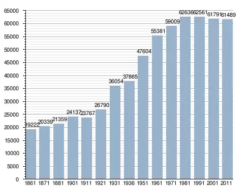 في سنة 1861 بلغ عدد السكان 19٬222 نسمة، وتطور العدد ليصل في سنة 2011 لـ 61٬489 نسمة.